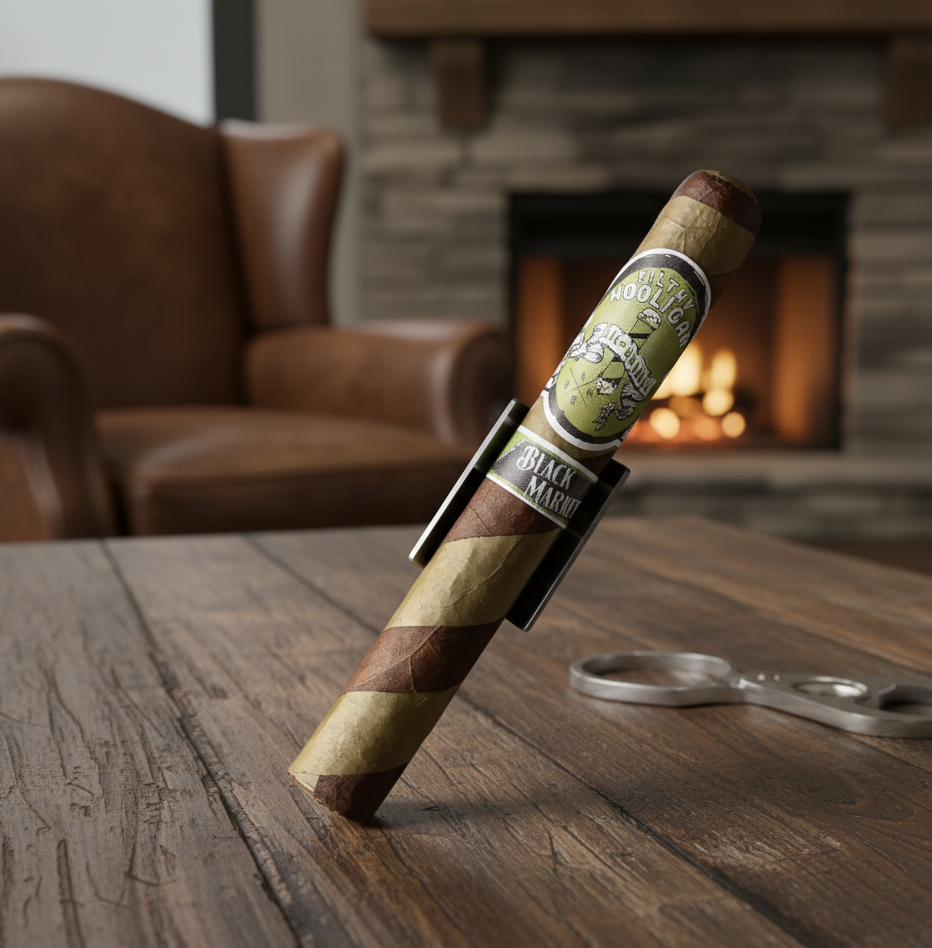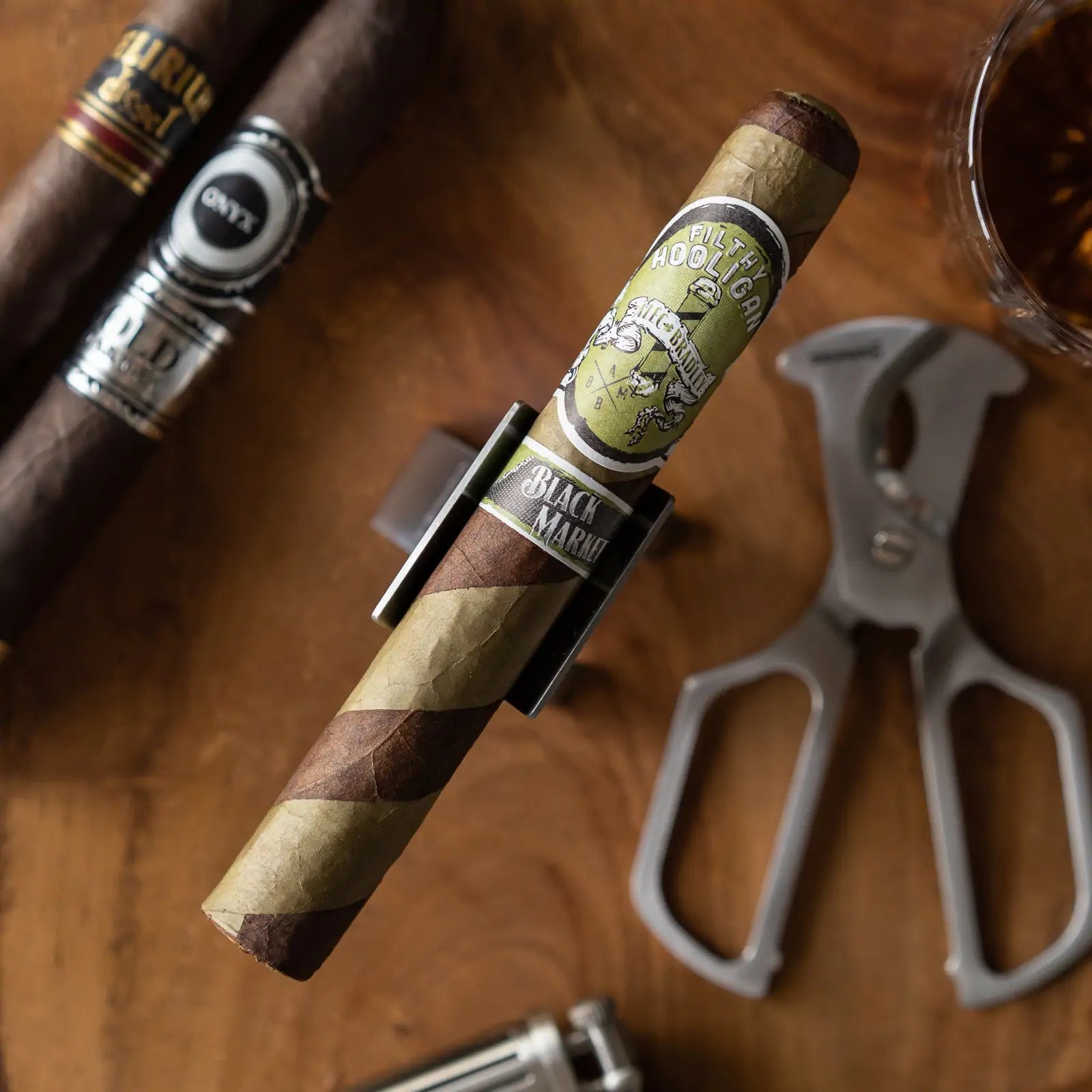 A striking seasonal release crafted for boldness, the "Black Market Filthy Hooligan Barber Pole Toro" pairs a vibrant Honduran Candela wrapper twisted with a rich Nicaraguan Habano/Oscuro leaf to create a barber-pole aesthetic and flavor match. Underneath sits a Sumatra binder and a long-filler blend from Honduras and Panama, all rolled in a 6" × 50 toro size that delivers a medium-bodied experience full of earthy wood, light spice, crisp pepper, and sweet vanilla notes—a smooth yet spirited smoke that stands out in both character and appearance.
